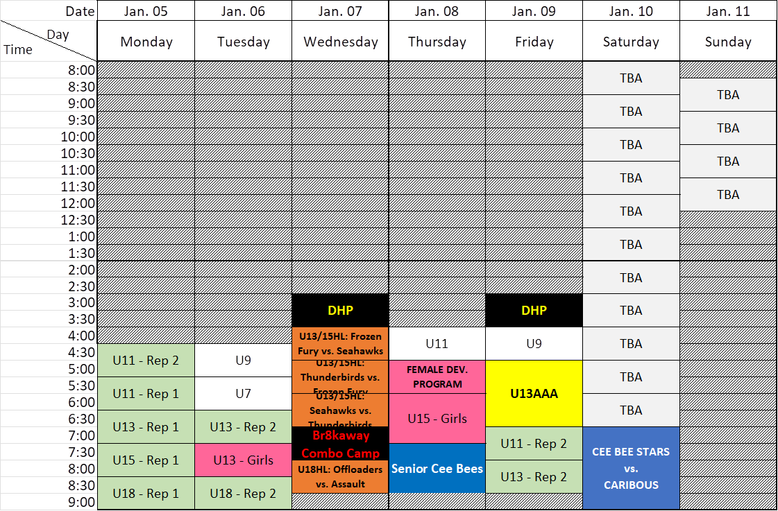 | 5:00 | U13/15HL: Thunderbirds vs. Frozen Fury | 1 & 3 | |