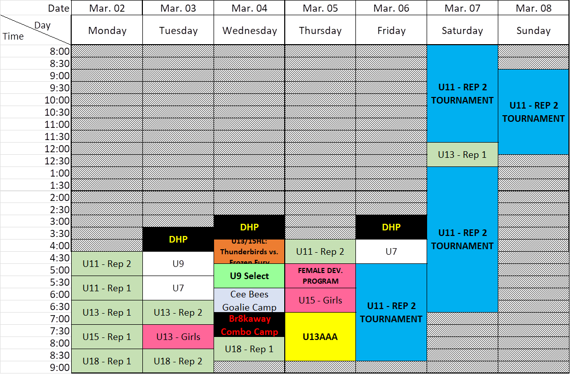 | 8:00 | U11 – REP 2 TOURNAMENT | See Tournament Schedule | |