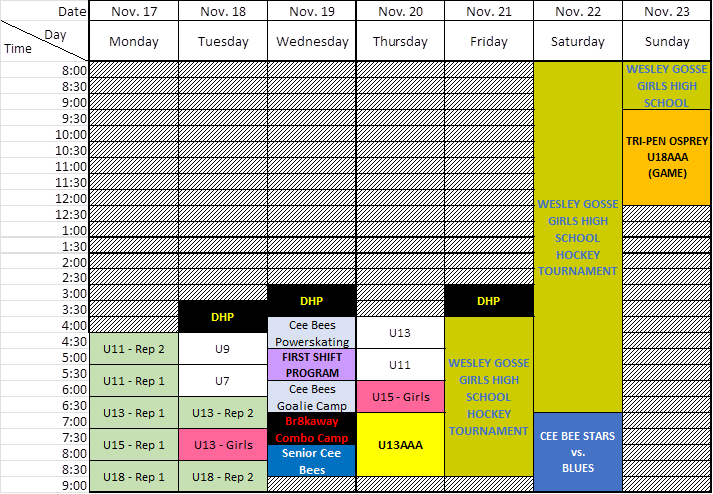| 6:00 | Cee Bees Goalie Camp | 4 | |